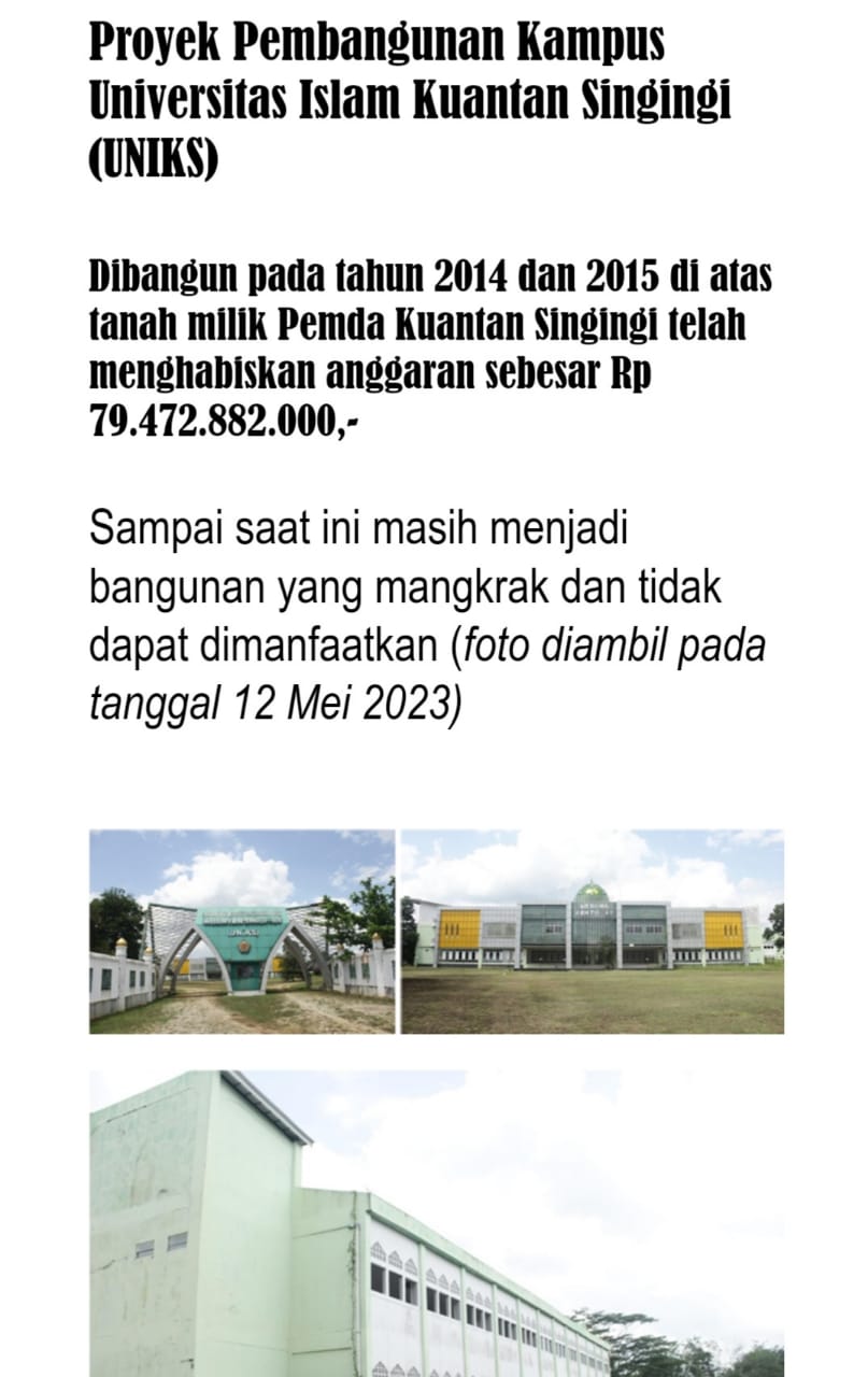 Dan Atas hal itu menggunakan KOP Bupati Kuansing perihal permohonan kepastian dan tindak lanjut penanganan proyek mangkrak di Kabupaten Kuansing yang ditujukan ke Kejaksaan Agung Republik Indonesia. Dalam surat tersebut orang nomor 1 di Kuansing meminta Kejati Riau dan Kejari Kuansing untuk melakukan penelitian, penyelidikan, dan penyidikan atas aset yang belum dapat dimanfaatkan oleh Pemkab Kuansing. Itu bisa saja menurut hemat saya bupati menilai kasus tersebut berjalan lambat dan belum tuntas wajar saja bupati mempertanyakan hal itu.