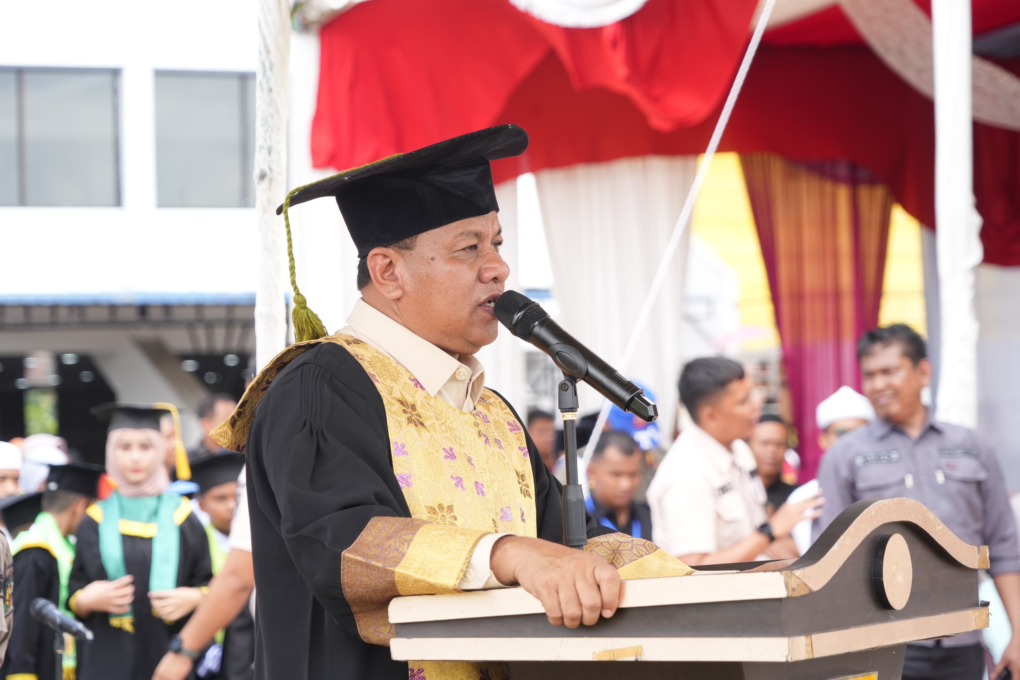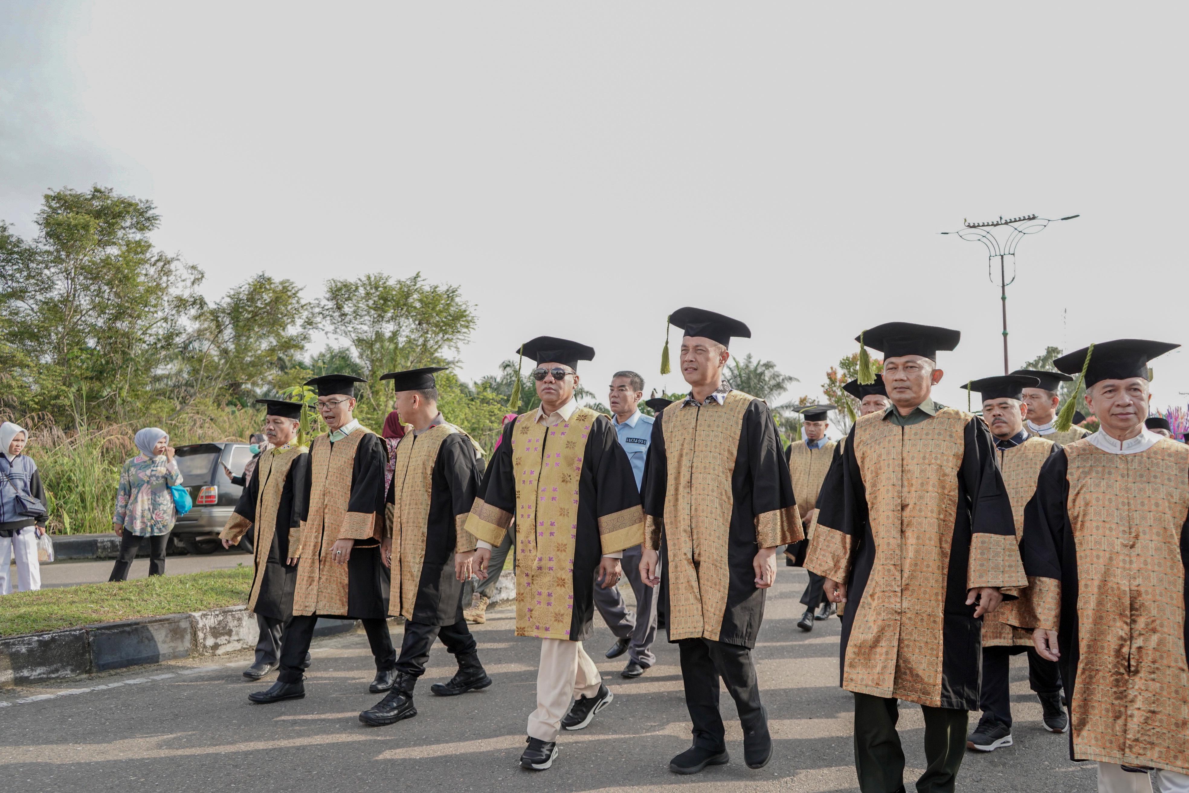 Turut hadir Forkopimda Kuansing, Pj Sekda Kuansing, Kepala Perangkat Daerah, Kakan Kemenag Kuansing, Asisten, Staf Ahli, Kepala Perangkat Daerah, Camat Se- Kuansing, serta ribuan orang tua dan keluarga wisudawan yang memenuhi tribun Barat stadion sport center untuk menyaksikan putra putri kebanggaan diwisuda oleh Bupati Kuantan Singingi.